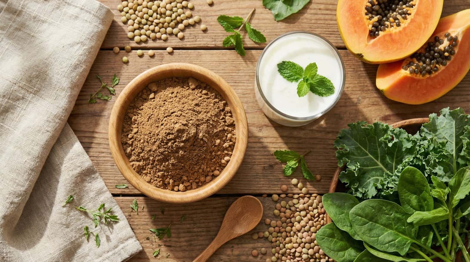 A bright flatlay of high-fiber foods like papaya, Triphala, and buttermilk showing the diet required so that can piles be cured without surgery.